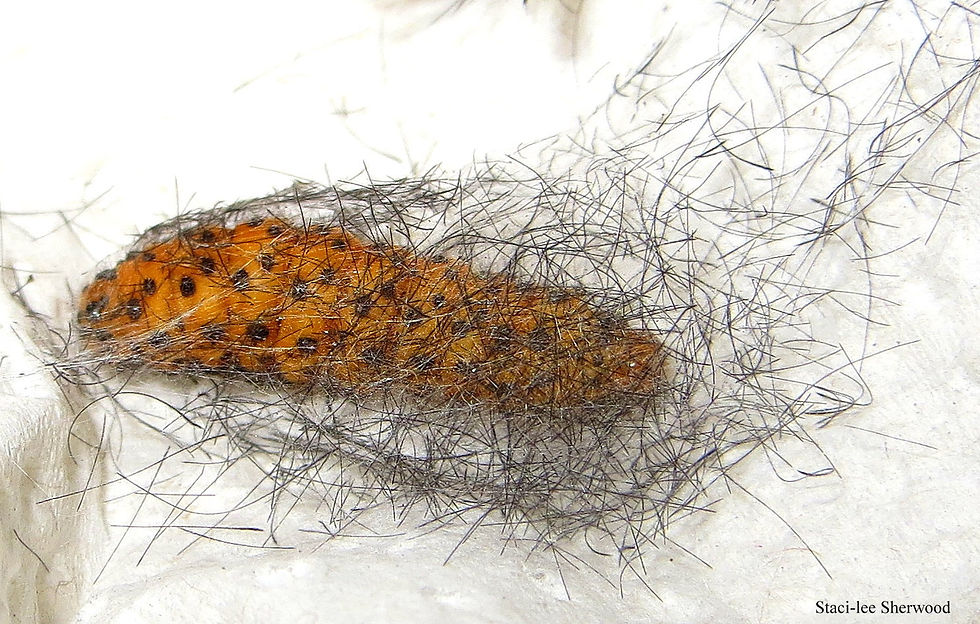 Newly hatched Polka-dot caterpillars next to hatched and unhatched eggs