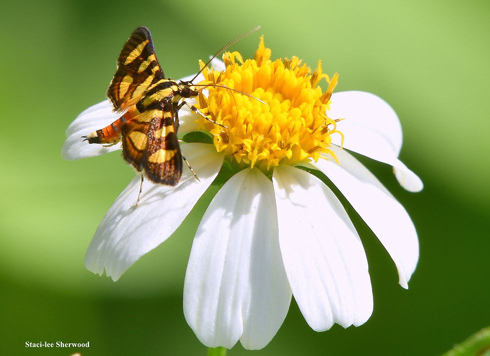 Here is the Orange-spotted flower moth, barely over 1 inch tip to tip, on Spanish Needle